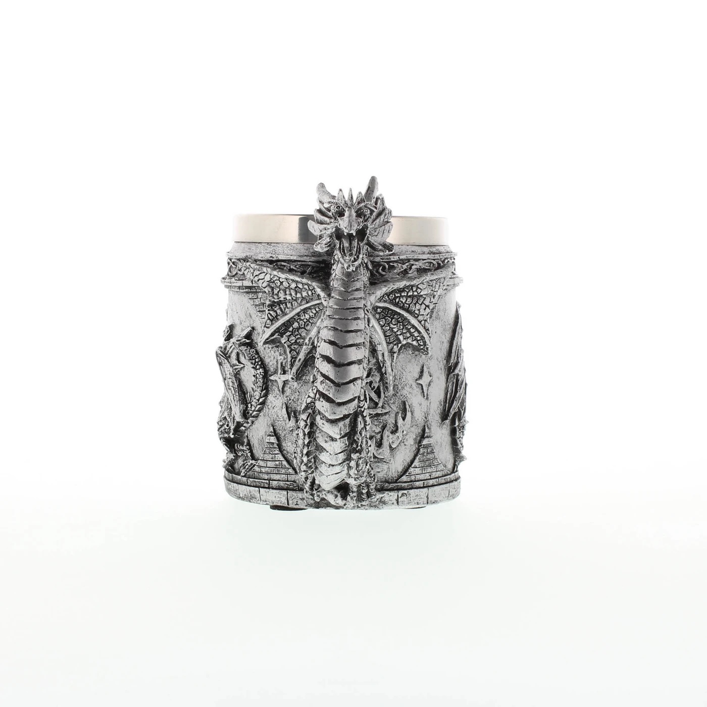 • This medieval-inspired mug is the most intimidating way to keep your items in order as a serpentine dragon guards your writing quills or your collection of coins stored within. Fully decorated with dragon reliefs and Celtic symbols, this mug will bring out the true warrior in you as it rests on your desk or bookshelf. (For decorative purposes only)
