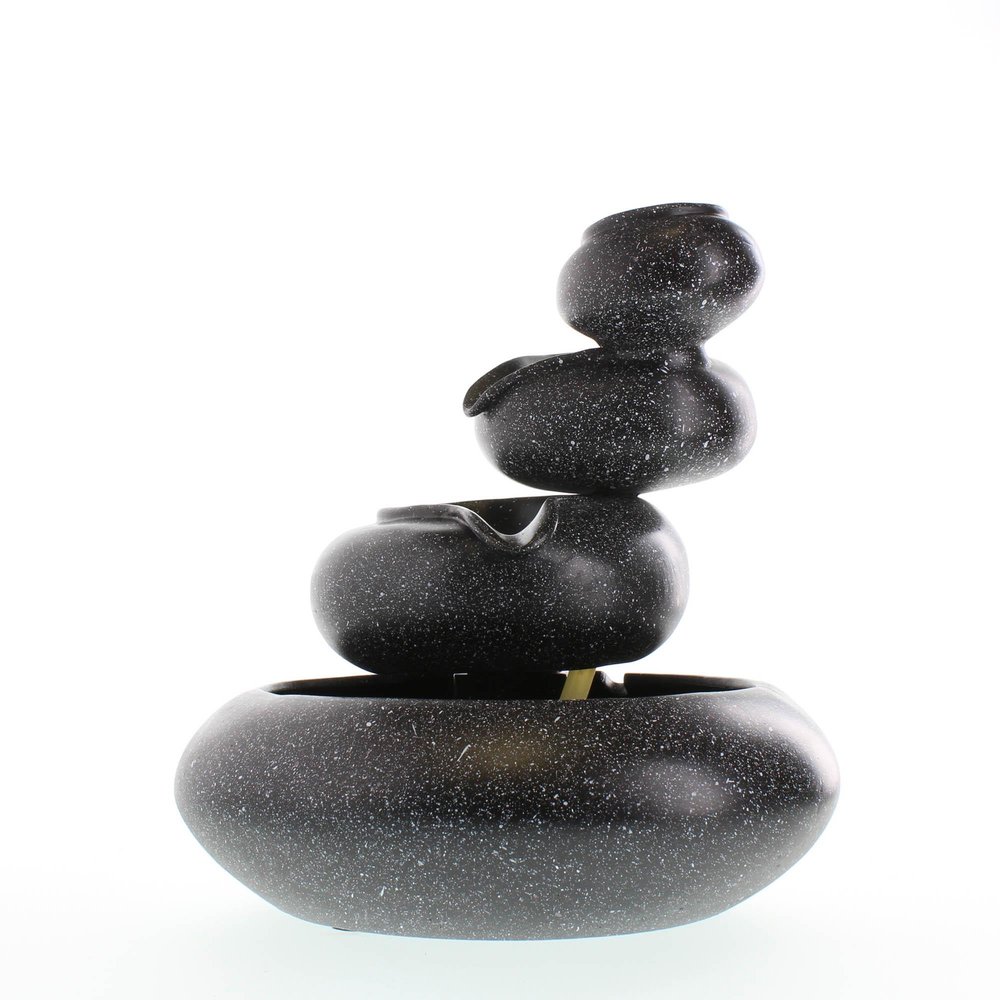 • Four granite-finished tiers cycle sparkling water from bowl to bowl, creating an enthralling meditation piece. The calming water sounds and compelling design will turn your space into a place of Zen.