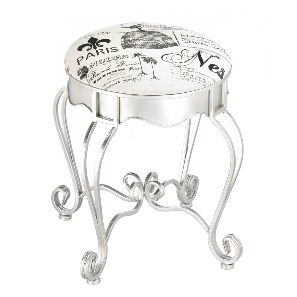 • Add a dash of European style to your room with this functional and fashionable foot stool. The metal base features pretty flourishes, and the canvas-covered cushion is printed with Parisian style. Maximum weight limit: 200 lbs.