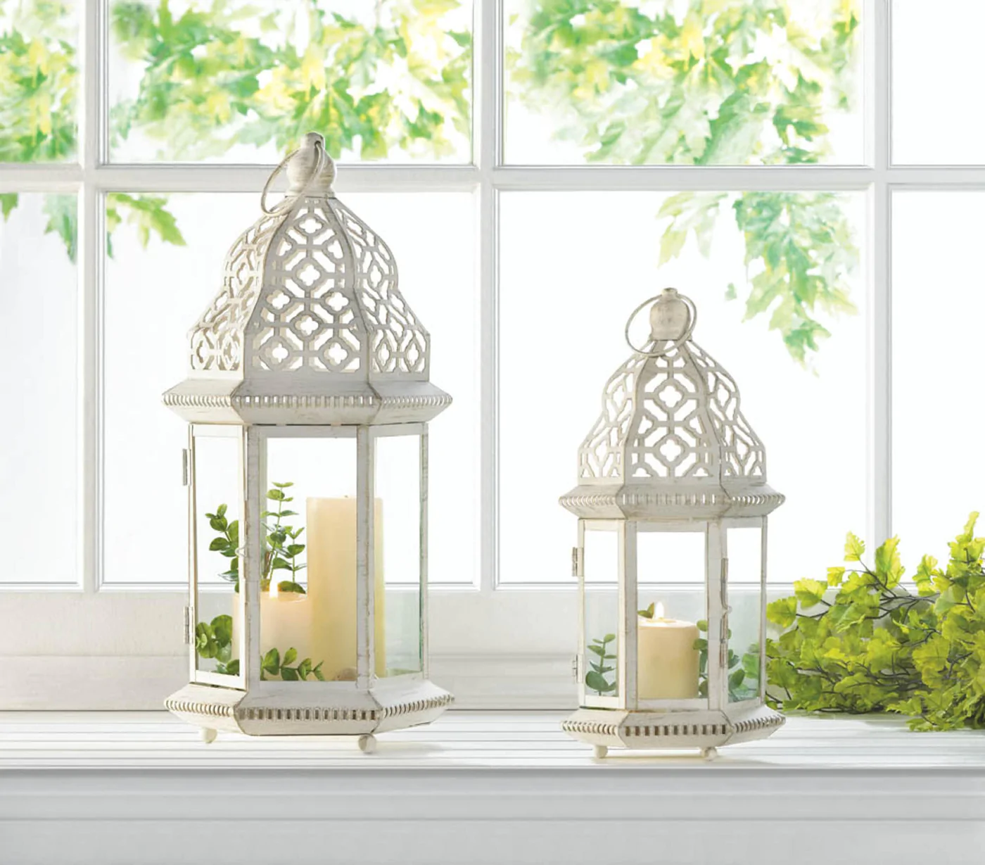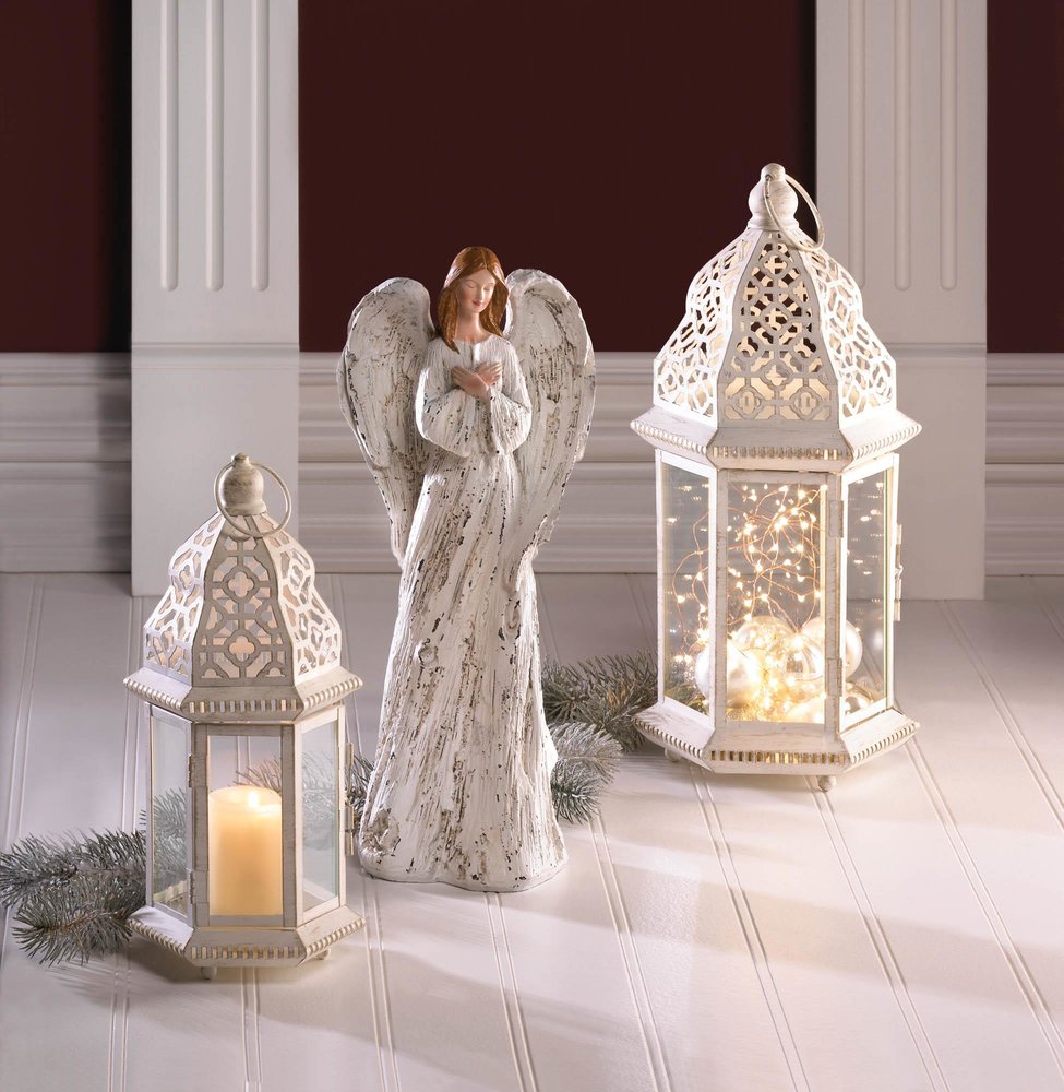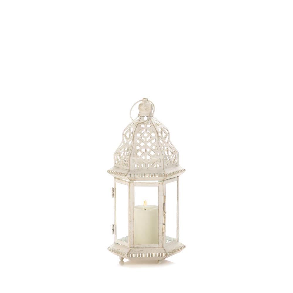 • A little bit of candlelight will go a long way when you light your favorite candle inside this beauty. The iron frame has a vintage white finish that perfectly showcases the intricate cutout details and flourishes.