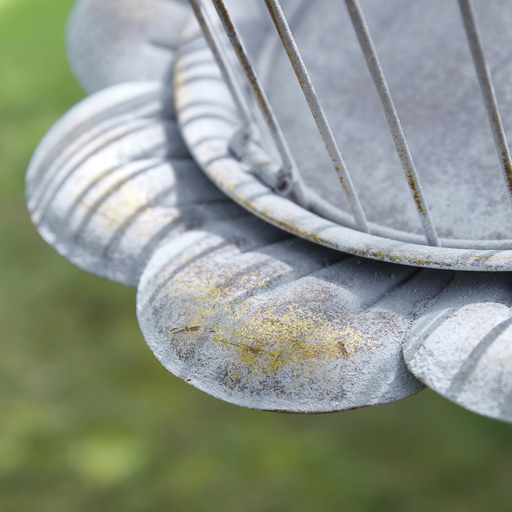 Our Birdcage Decor boasts a graceful, ornate design, reminiscent of classic Victorian-era craftsmanship. Place a candle or potted plant inside or use as a feeder. This item is crafted from metal and is 39''H with its hook and chain extended. The entire dome opens with a latch at the base.