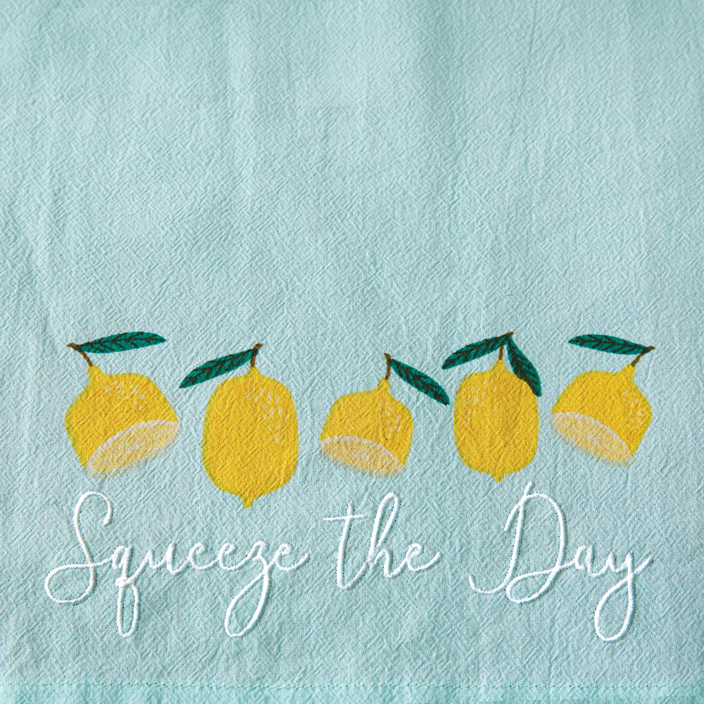 Squeeze the day! This fun and bright kitchen essentials set will add a pop of color into your cooking area. Set includes an apron and tea towel. Tea towel is 20''W x 28''H. Apron has a neck tie, a waist tie, and a pocket in the front. Made of 100% cotton. Tea towel features a corner hanging tab. 100% Cotton. Machine wash cold. Tumble dry. Warm iron on reverse.