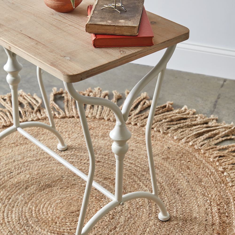 The Emmeline Petite Table is inspired by vintage sewing tables. It is made from metal and has a wood tabletop.