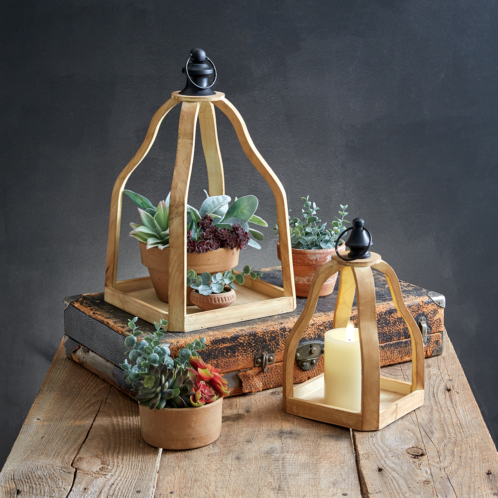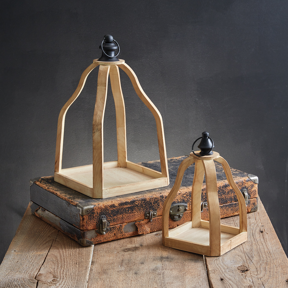 This set of pear shaped open air lanterns are a versatile set that blends with almost any decor. Each lantern is fashioned with wood and features a metal ring and finial on its top. Fill with candles or succulents to create a beautiful tabletop display or hang in an intricate wall gallery. Smallest lantern measures 6½''W x 6½''D x 11''H.