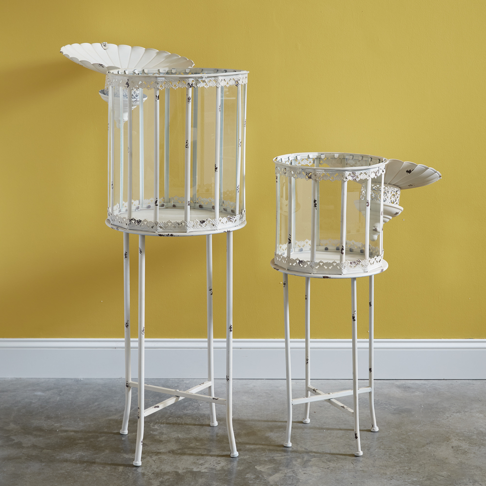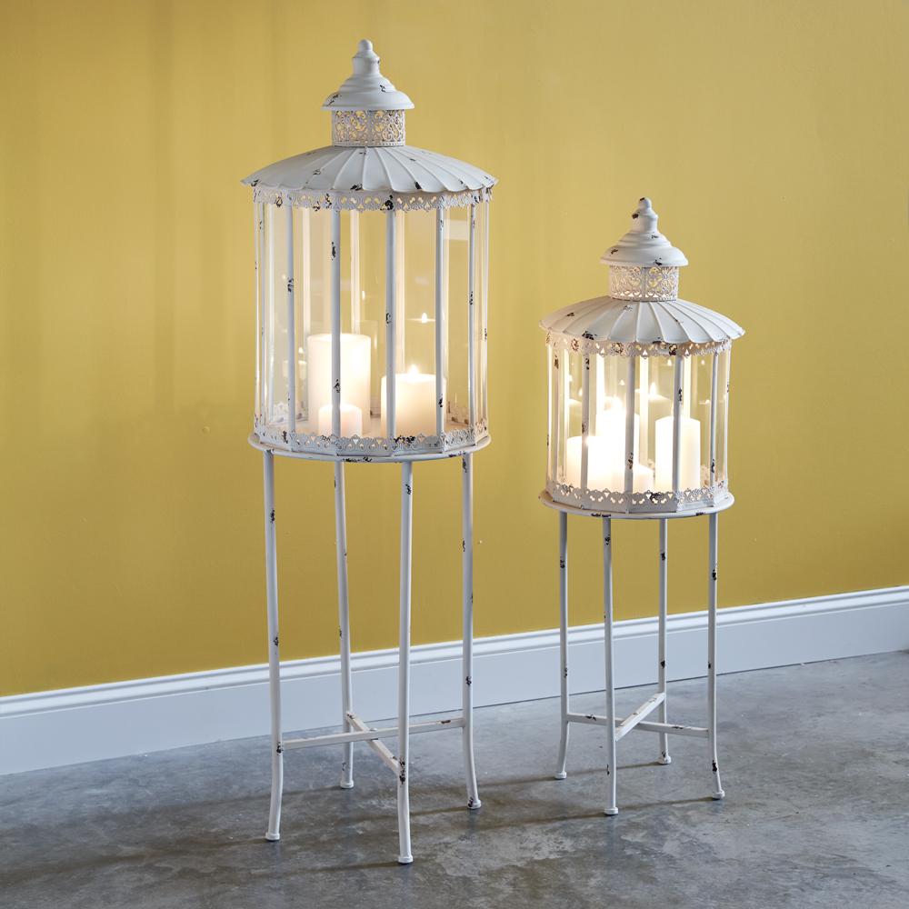 Grandiose in stature and detailed with dainty French accents, these freestanding lanterns are beautiful statement pieces for a home. Fill with multi-sized candles or succulents. Item breaks down for easy storage and features a hinged access lid on its top. Smallest lantern measures 14'' dia. x 40''H.